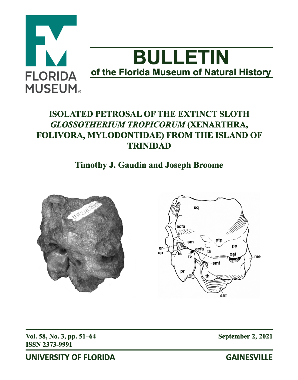 Vol. 58 No. 3 (2021): Isolated petrosal of the extinct sloth Glossotherium tropicorum (Xenarthra, Folivora, Mylodontidae) from the island of Trinidad